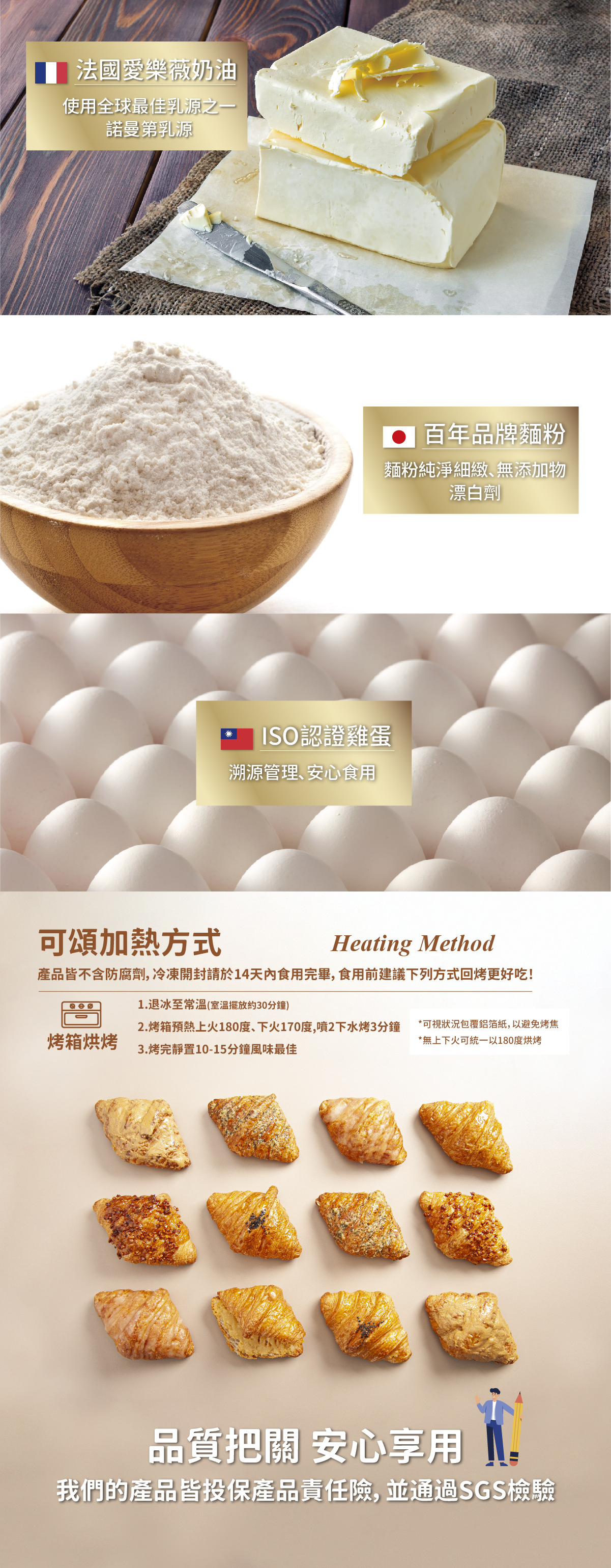 堅持日式職人精神,嚴選世界級優質食材(法國愛樂薇奶油、日本百年大廠麵粉與 ISO認證雞蛋), 呈現天然奶油的清香、 並運用獨門摺層手法 才能擁有外層酥脆誘人、 內層鬆軟細緻的多層次完美口感。